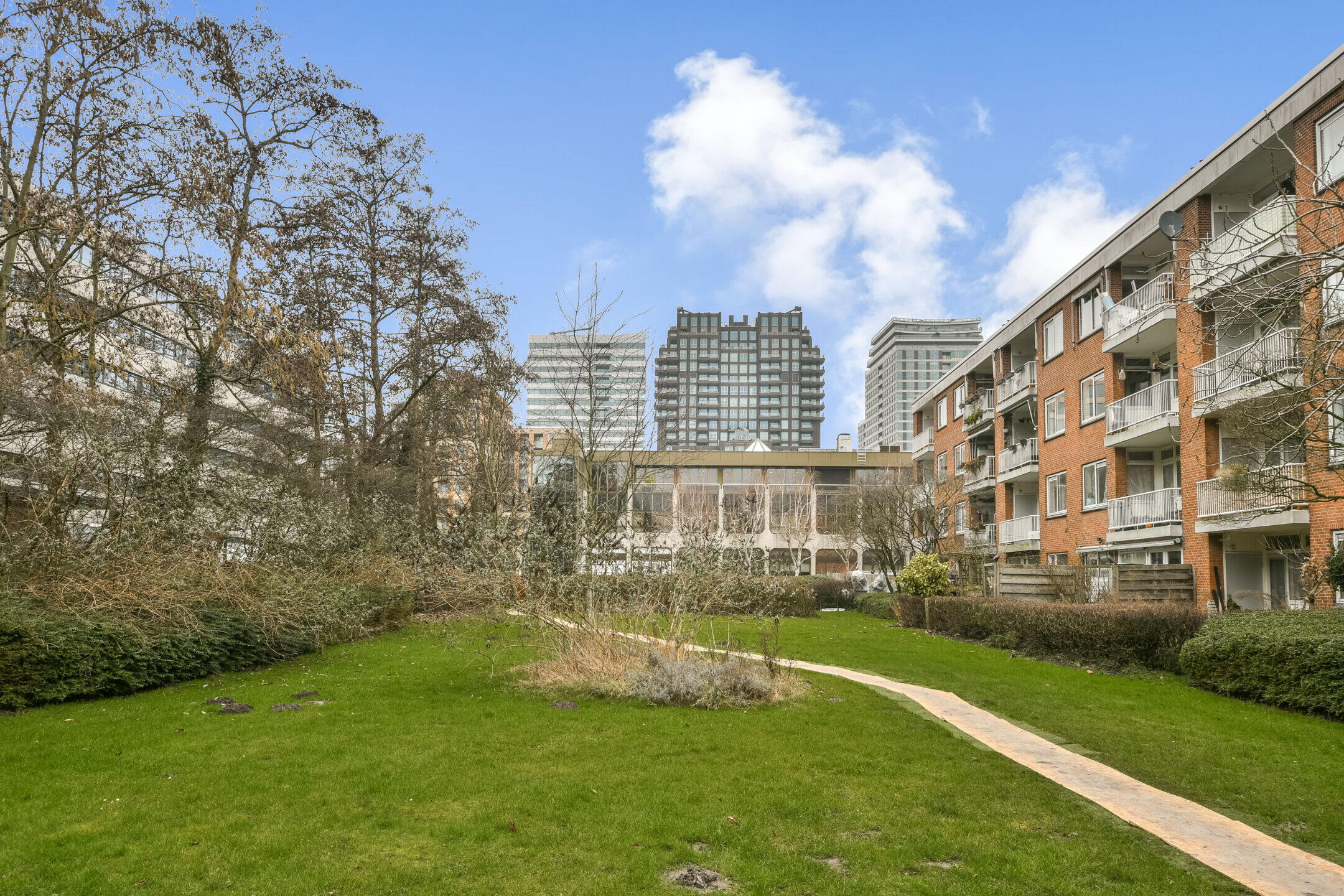The complex is located in a quiet, green neighborhood and is just around the corner from the Zuidas, Station Zuid, the VU University, and the completely renovated luxury shopping center Gelderlandplein. Nearby are the Amstelpark and the Amsterdamse Bos. The neighborhood offers plenty of amenities that add to the lively atmosphere, such as Bar Boele in the new university building, Theater Griffioen, Rialto cinema, and the recently opened Cinema The Pulse. Numerous facilities are close by, including various sports facilities and a wide range of (international) schools.